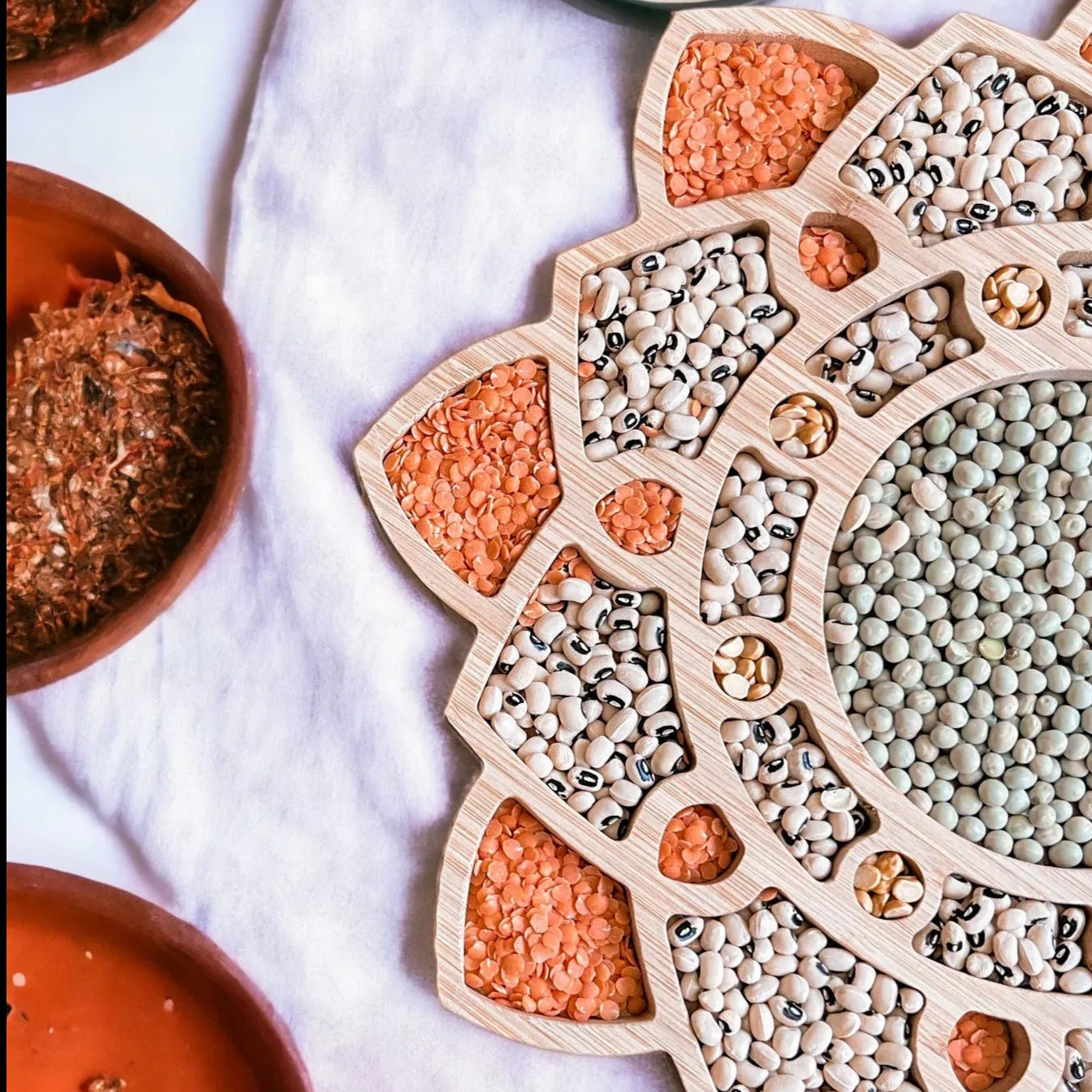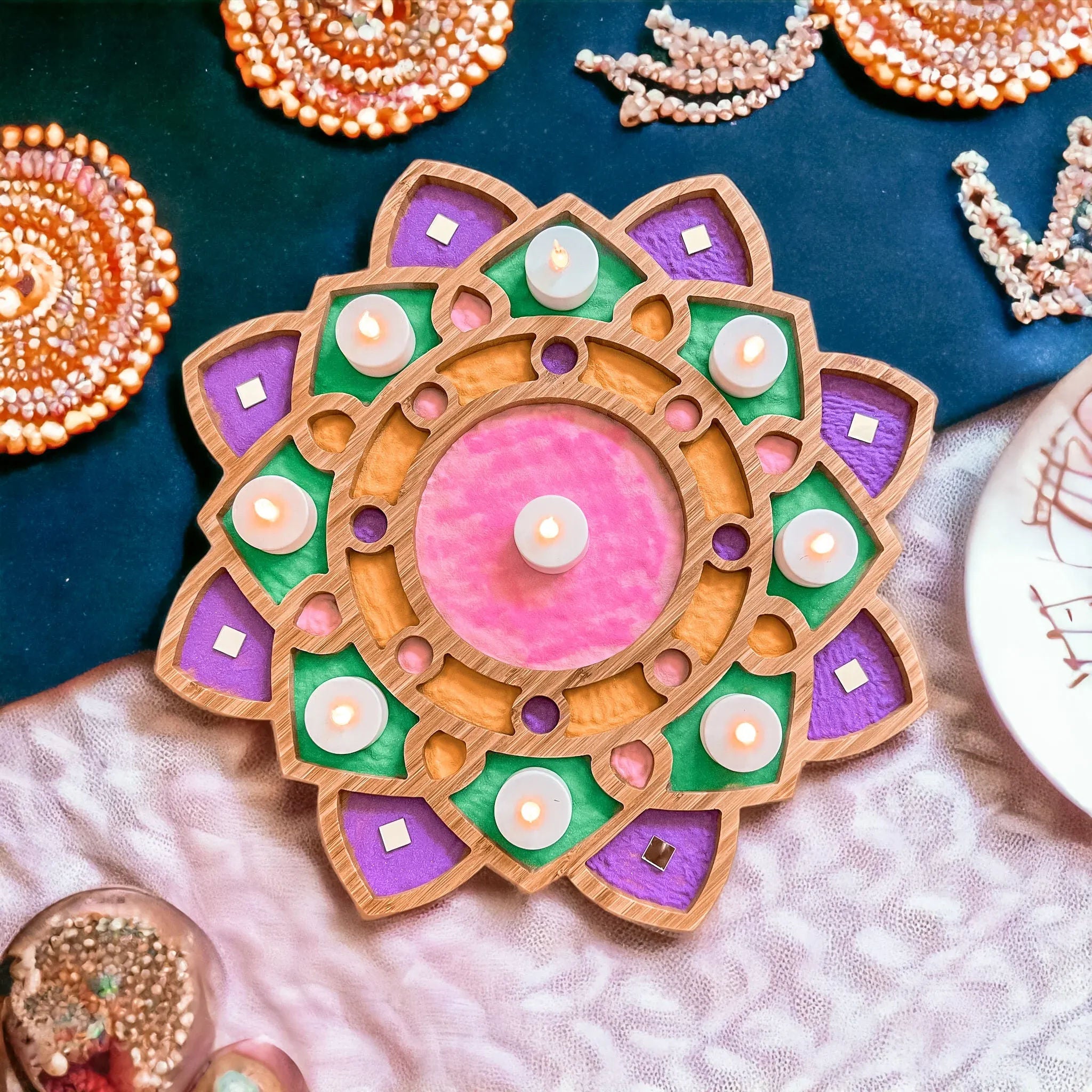 4. Versatile: Our wooden Rangoli tray is designed to accommodate various decorative elements such as flowers, candles, lentils, nuts or colored rice. Let your creativity flow and customize your Rangoli design to suit your personal style and preferences.