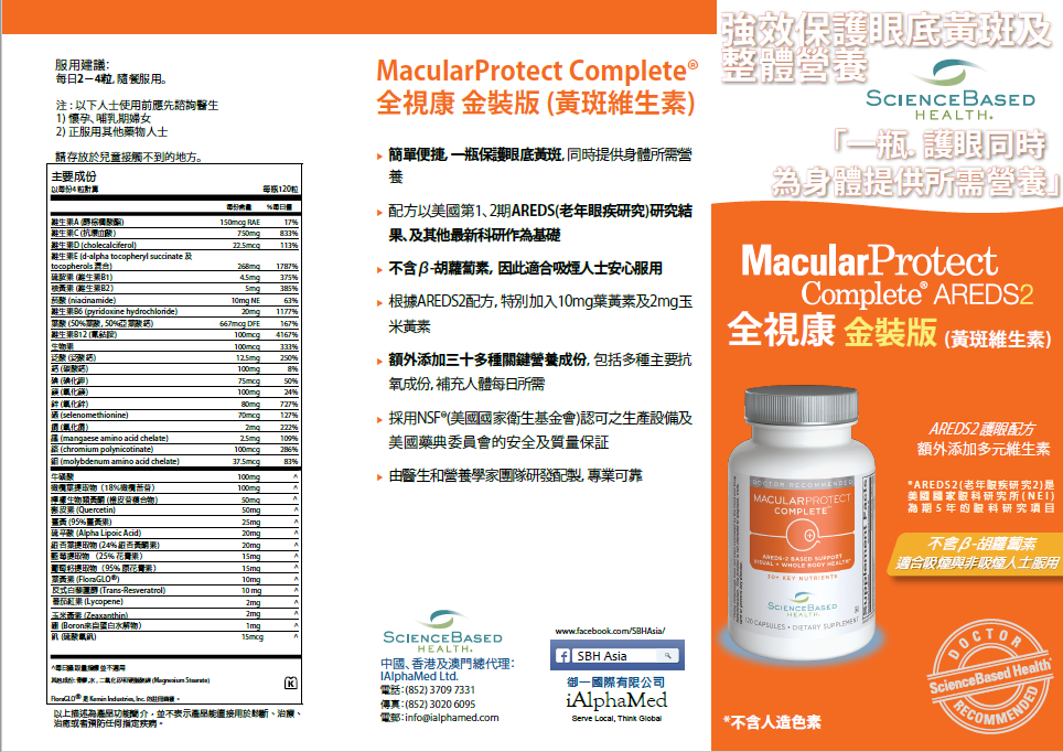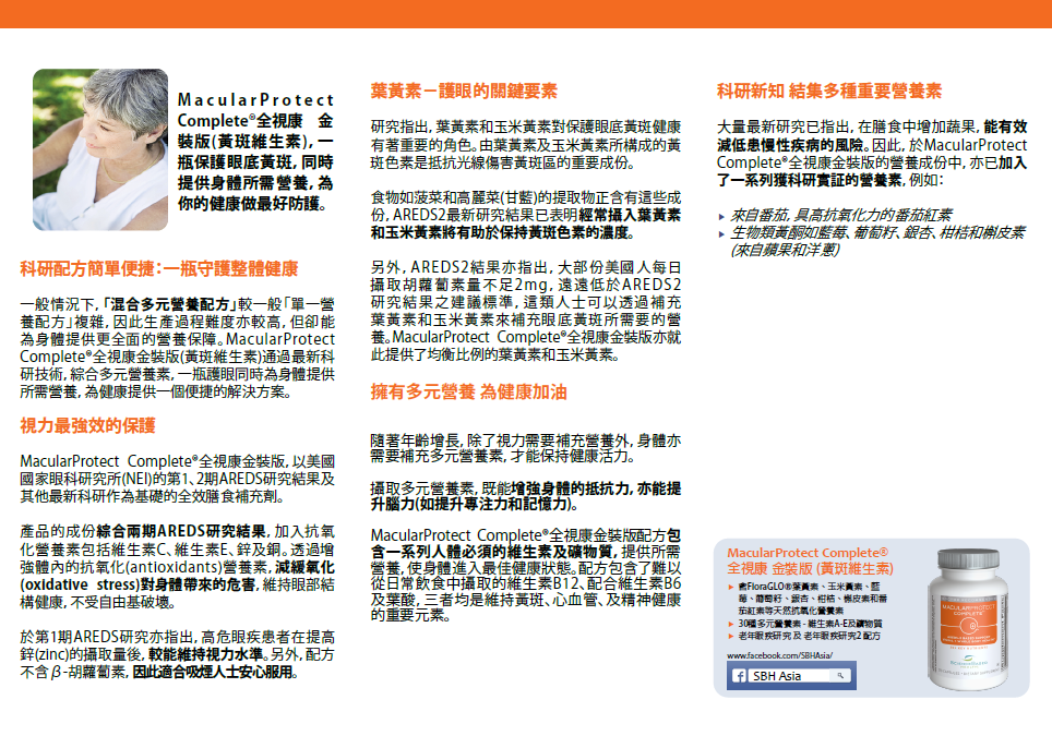 研技術,綜合多元營養素,一瓶護眼同時為身體提供所需營養,為健康提供一個便捷的解決方案。 - MacularProtect Complete®全視康金裝版,以美國國家眼科研究所(NEI)的第1、2期AREDS研究結果及其他最新科研作為基礎的全效膳食補充劑。